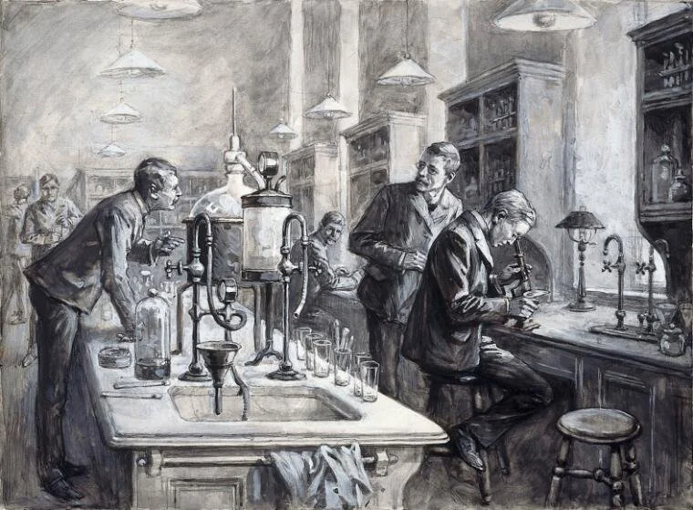 Made by a press artist, a gouache (a type of painting created using an opaque watercolor technique) of researchers at the Liverpool School of Tropical Medicine at the time of its inauguration similarly projects an image of resilience and medical preparedness. It documents the formalization of the Tropical Medicine field in the establishment of the first school dedicated to its study in 1898 and the use of the microscope in line with the evolving germ theory of disease. As a major seat of empire, the port city of Liverpool was frequently afflicted by “tropical” disease. Outstanding physicians and scientists took up prestigious positions at the new institution, notably Ronald Ross who in 1897 discovered the malarial parasite in the gastrointestinal tract of a mosquito, thus generating new understanding of the disease’s transmission. In tracing a long development of the concept of tropical medicine through imperial history as investment in the healthcare of European troops and settler populations in the tropics, historian of medicine and empire Pratik Chakrabarti notes the Liverpool School’s work training doctors for colonial service in “a medicine for empire where diseases were the great enemies of civilisation.” Nineteenth-century Africa, he remarks, was seen as a “white man’s grave.”[3] The Liverpool School was founded by and with the financial support of Alfred Lewis Jones, a shipping magnate with expansive interests in Jamaica and West Africa and a close engagement with the “Belgian Congo” and King Leopold II, who also made substantial donations to the school.